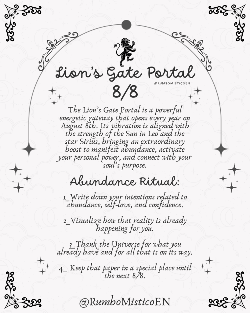The 8/8 portal, often known as the Lion’s Gate, is one of the most powerful of the year. The number eight symbolizes infinity, personal power, and abundance in all its forms.