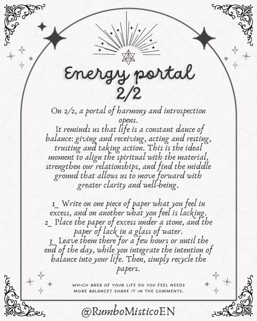 The 2/2 energy portal opens a frequency of harmony, cooperation, and conscious introspection. This energy invites you to slow down, listen to your intuition, and observe relationships, decisions, and inner processes with greater sensitivity.